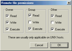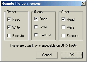 2.1. Bedeutung von Zahlen & Buchstaben > Datei markieren, Rechtsklick und im Kontextmenü chmod (Unix) wählen. Nun seht ihr das folgende Bild. |