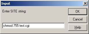 Wenn man komplette FTP-Befehle eingeben möchte kann man aus dem Kontextmenü auch QUOTE an Stelle von SITE auswählen. In diesem Fall müsste der obere Befehl SITE chmod 755 test.cgi heißen. Hier lassen sich dann auch die FTP-Befehle benutzen, welche nicht im FTP-Commands Menü als Alias aufgelistet sind (z.B.: NOOP, QUIT oder zum löschen von Ordnern RMD).