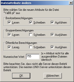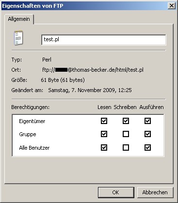 öffnen: Nach dem Ausführen des Befehls noch das Kennwort eingeben und anmelden! Jetzt den üblichen Rechtsklick auf die Datei oder den Ordner tätigen und ganz unten die Eigenschaften auswählen. Folgend ein Bild mit den Rechten 755 für eine Perl-Datei unter Windows XP SP3.
